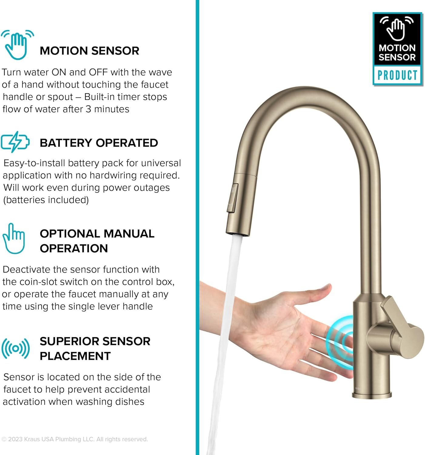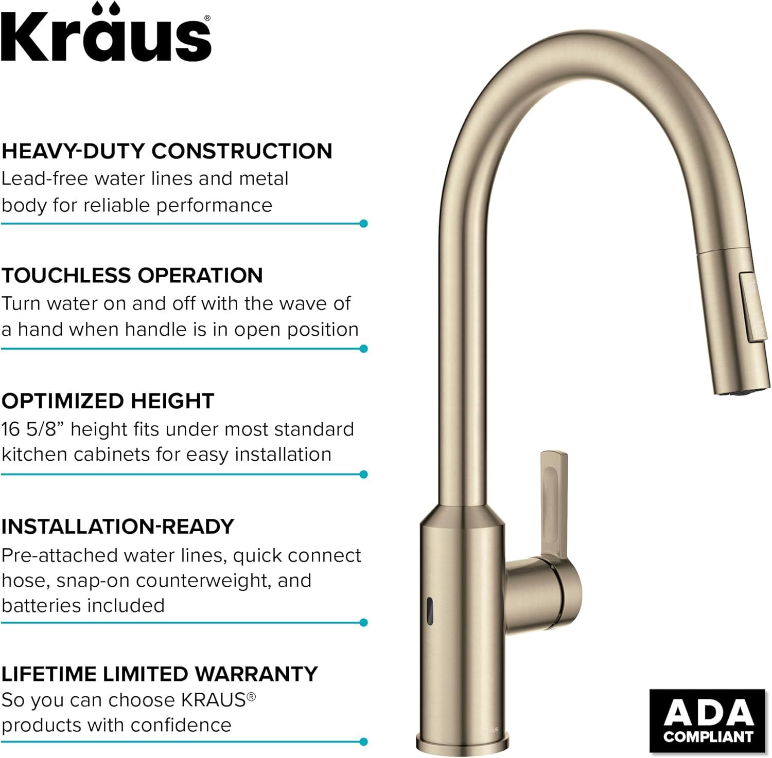 The KRAUS Oletto Touchless Kitchen Faucet KSF‑2830SFACB brings modern convenience and sleek style to any kitchen: with motion‑sensor activation, a pull‑down spray head that switches between stream and spray, and a 360°‑swivel high‑arc spout, it’s designed for seamless, hands‑free washing and rinsing. The spot‑free antique‑champagne finish resists water spots and fingerprints, while the included hardware and battery‑powered design make installation quick and easy. Ready to upgrade your kitchen faucet?