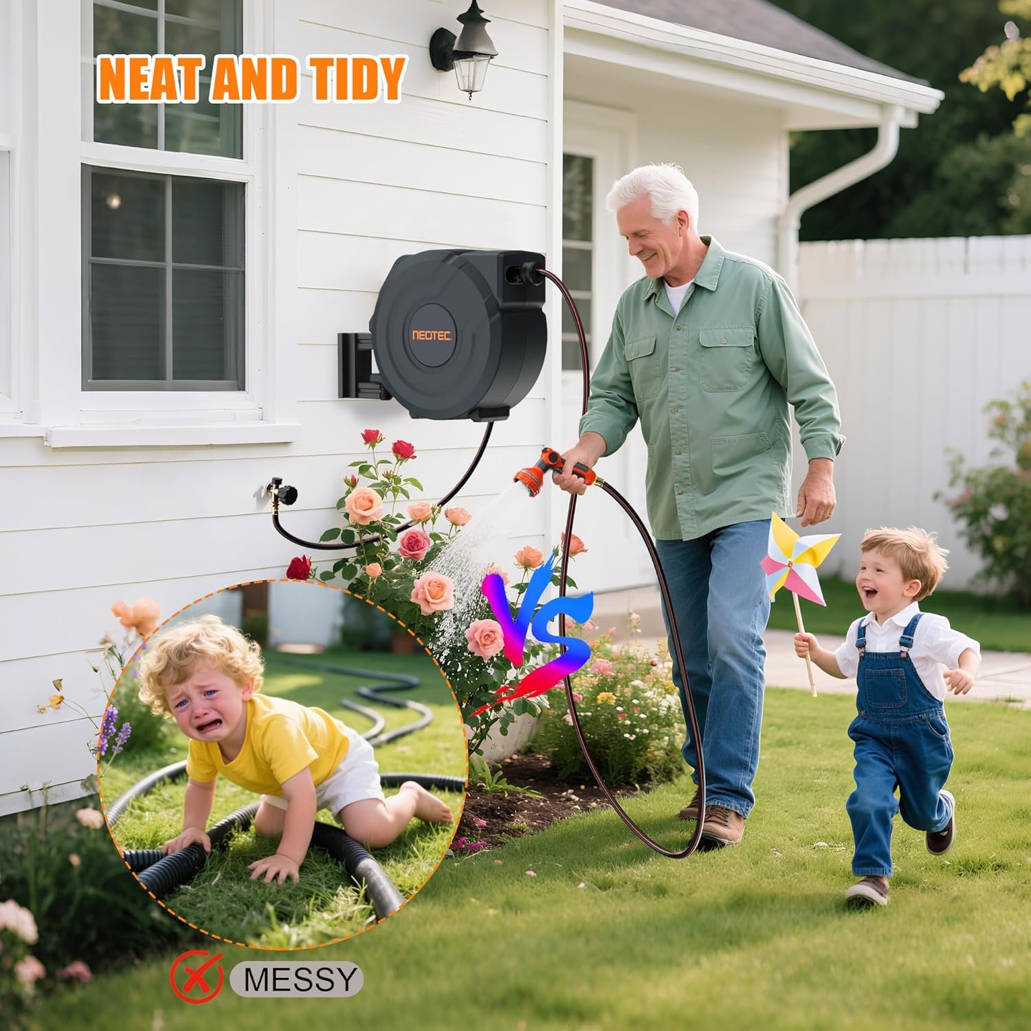 NEOTEC Retractable Garden Hose Reel 5/8 inch x 90ft – Wall Mounted Heavy