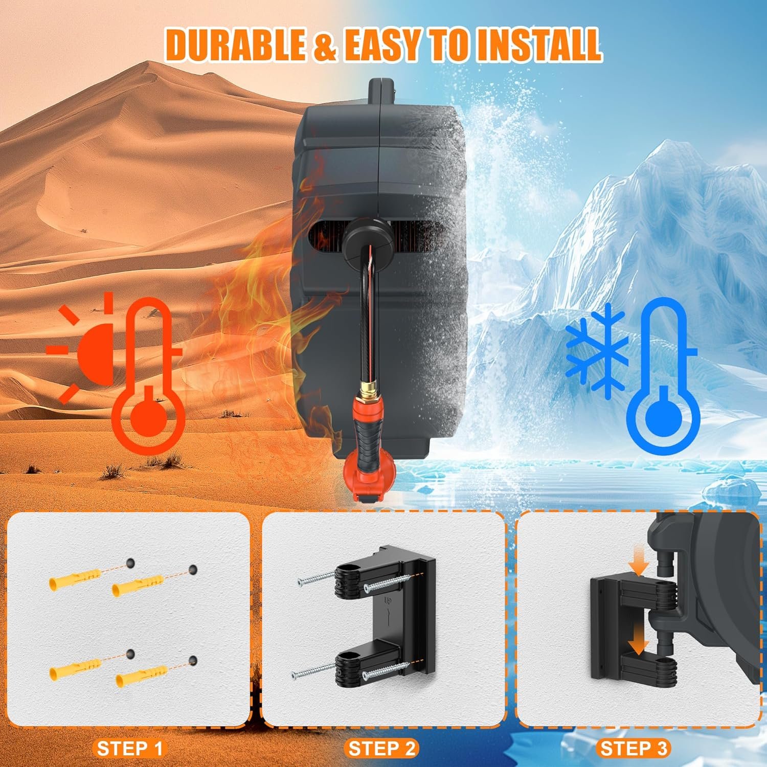 The NEOTEC Retractable Garden Hose Reel offers a smooth auto-rewind system with a 5/8-inch, 90-foot hose for effortless watering. Designed with a 180° swivel wall bracket, durable brass fittings, and a 9-pattern nozzle, it ensures convenience and flexibility in every use. Its heavy-duty construction provides long-lasting performance, making it the perfect addition to any garden or outdoor space.