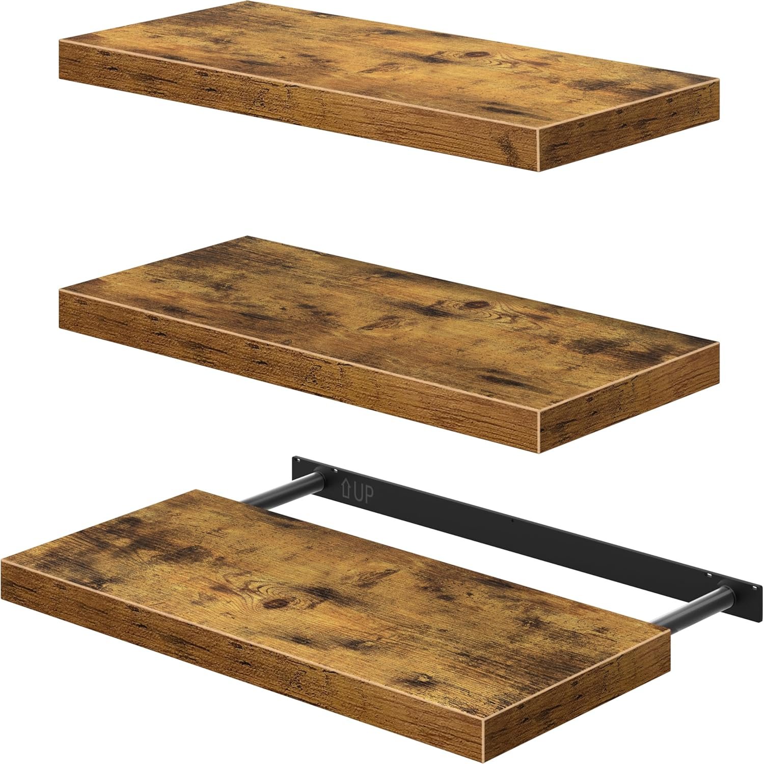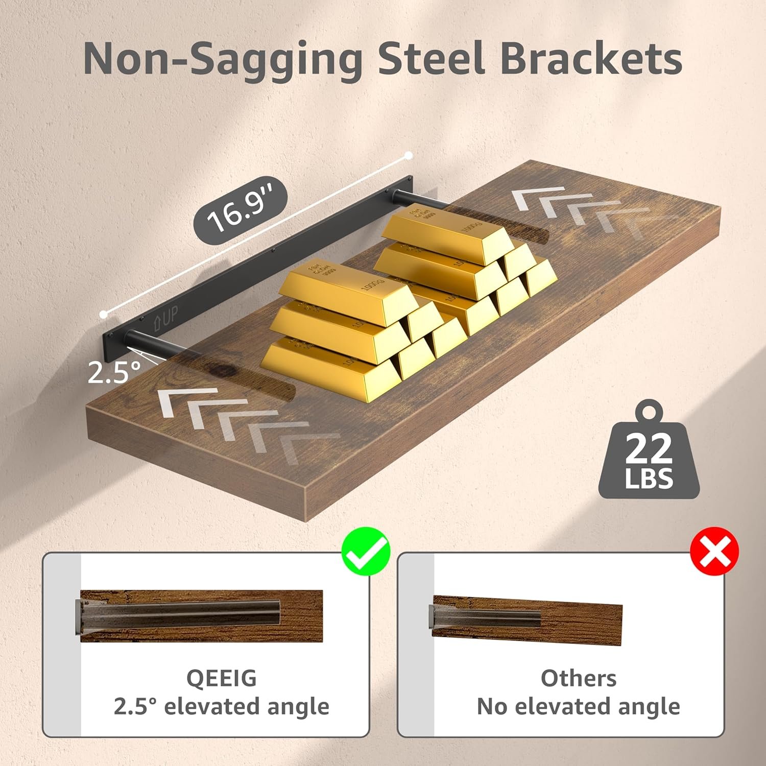 Enhance your space with the QEEIG 10" Deep Floating Shelves, crafted from FSC-certified wood for eco-friendly durability. Each shelf measures 10"D x 23.6"W x 1.5"H, offering ample storage for books, decor, or toiletries. The set of three rustic brown shelves features enhanced steel brackets that support up to 22 lbs, ensuring sturdy, sag-free placement. Perfect for bathrooms, bedrooms, kitchens, or living rooms, these shelves add both functionality and farmhouse charm to any room.