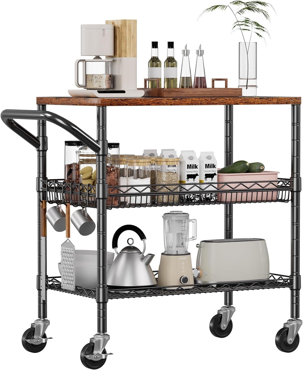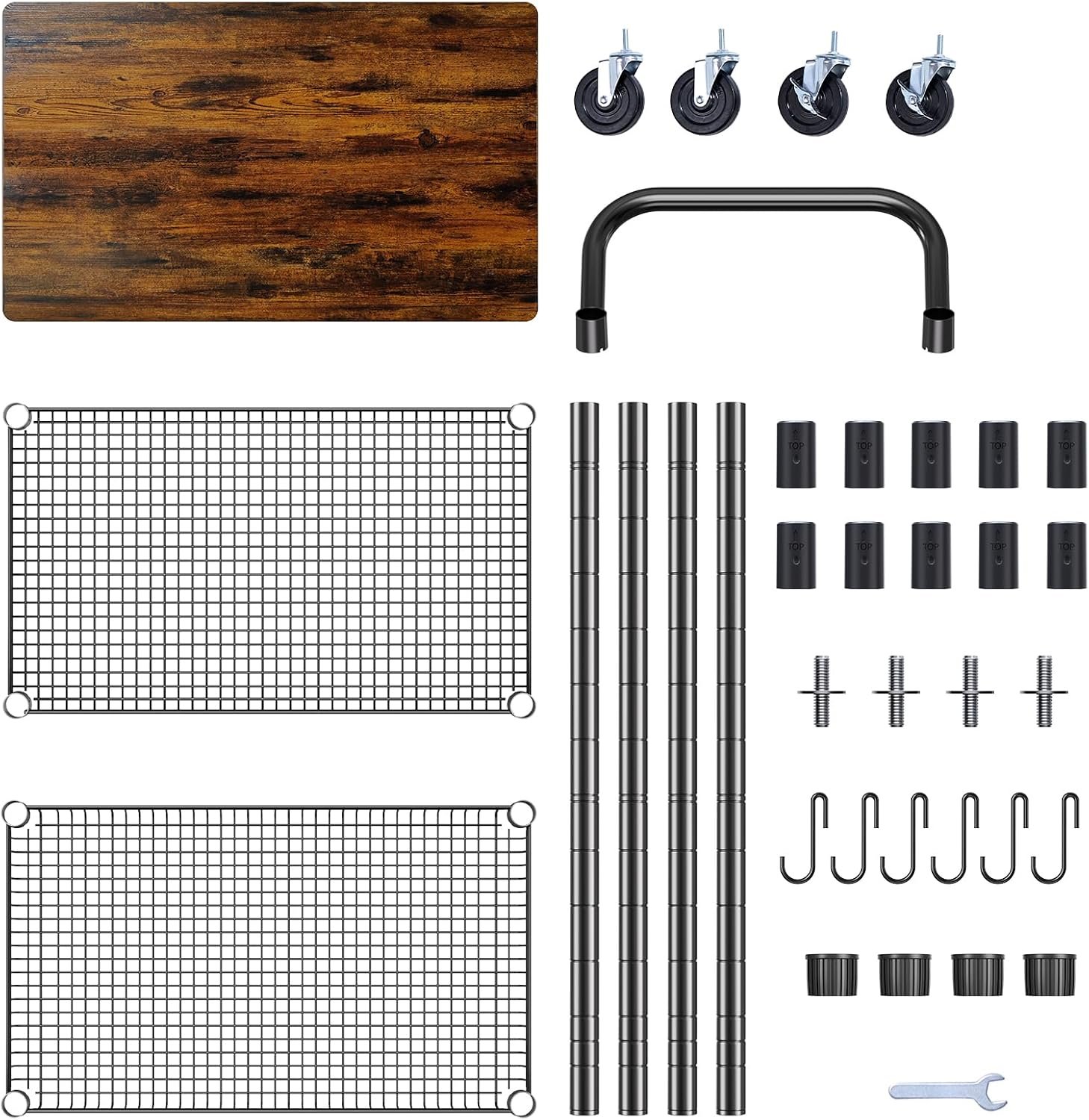 The WDT 3-Tier Rolling Utility Cart features a durable 21 mm wood tabletop and heavy-duty metal frame, supporting up to 650 lb total. Equipped with smooth 360° casters (two lockable), adjustable wire shelves, and six hooks for versatile storage, it’s perfect for kitchens, workshops, or offices. Click to learn more about this sturdy and mobile utility solution.