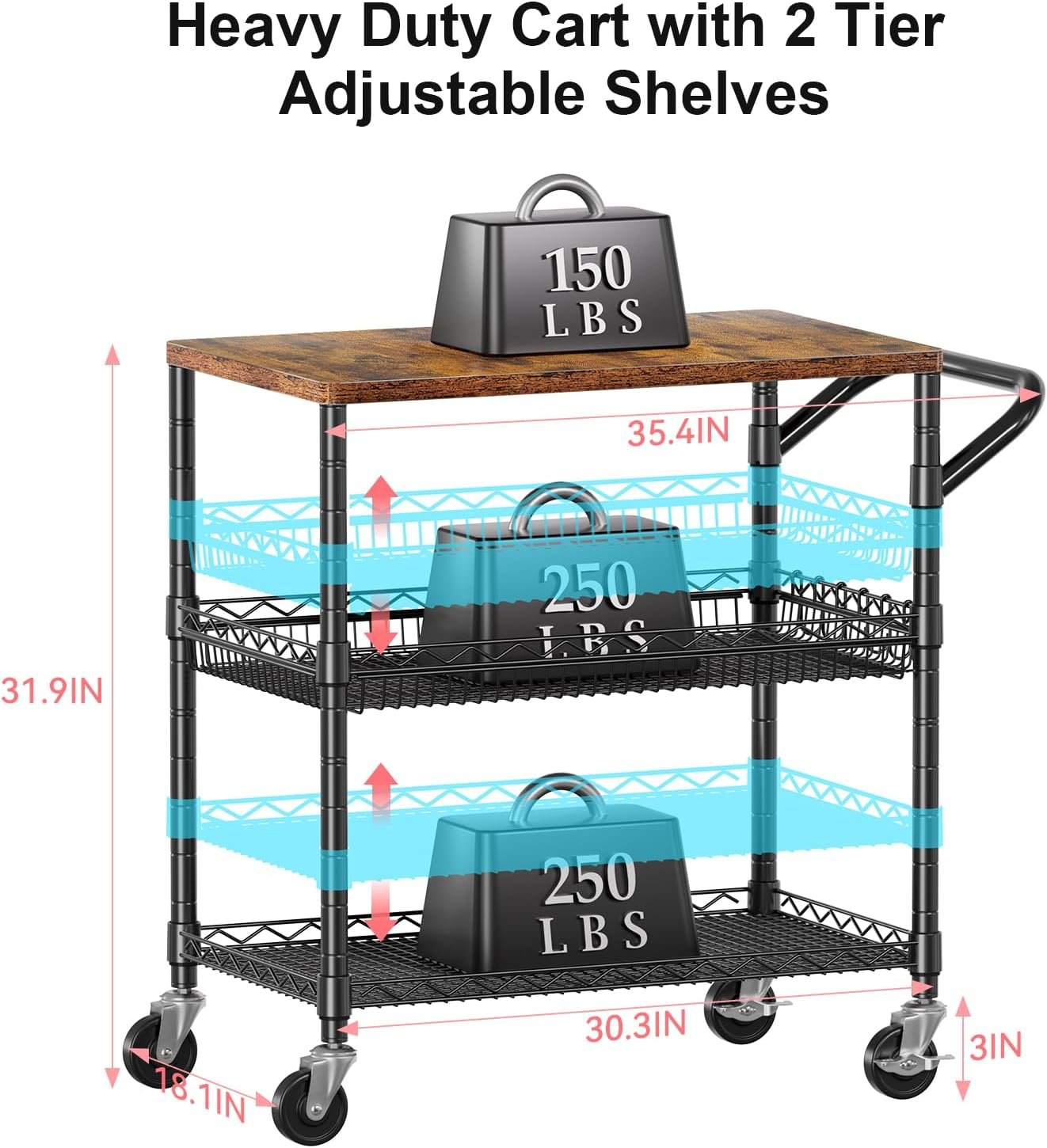 The WDT 3-Tier Rolling Utility Cart with Wood Tabletop combines durability and functionality for home or commercial use. Built with a sturdy metal frame and a thick 21mm wooden tabletop, it supports up to 650 lbs and offers reliable performance. The cart features smooth 360° wheels, two lockable for stability, adjustable wire shelves, and six hooks for convenient storage. Perfect for kitchens, workshops, and offices, it delivers both strength and mobility.
